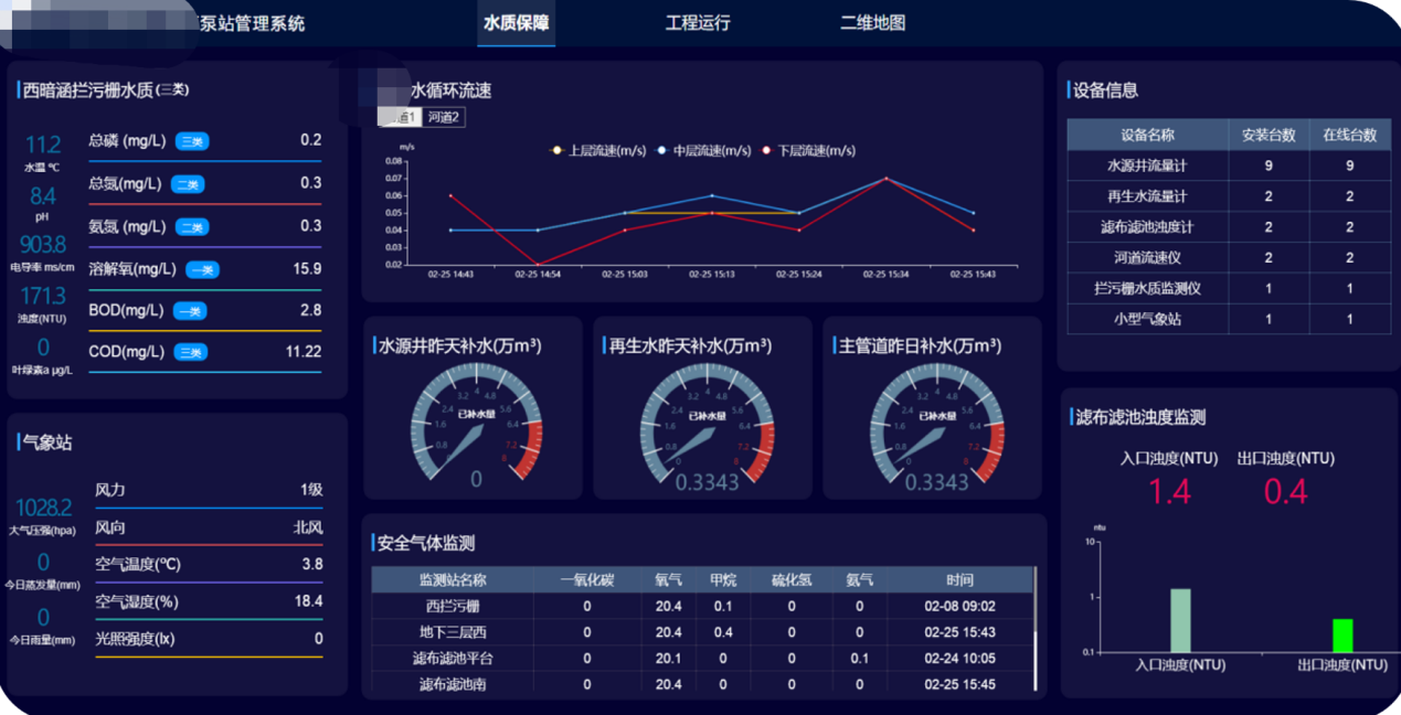 泵站智能调度管理系统通过对泵站系统布设智能感知硬件,对泵站生产运行进行实时监测,包括流量监测、压力监测、液位监测、噪音监测等,提高数据采集能力,通过“输入、响应、优化、调控”,实现感知信息化、运行智慧化、三维数字化、少人值守式数智化泵站系统,降低运营管理人员投入,提升人员效率,提升设备信息化管理水平,降低运行成本,提升运行管理水平,达成“避险合规、降本增效”,保障城市水务安全防线。
