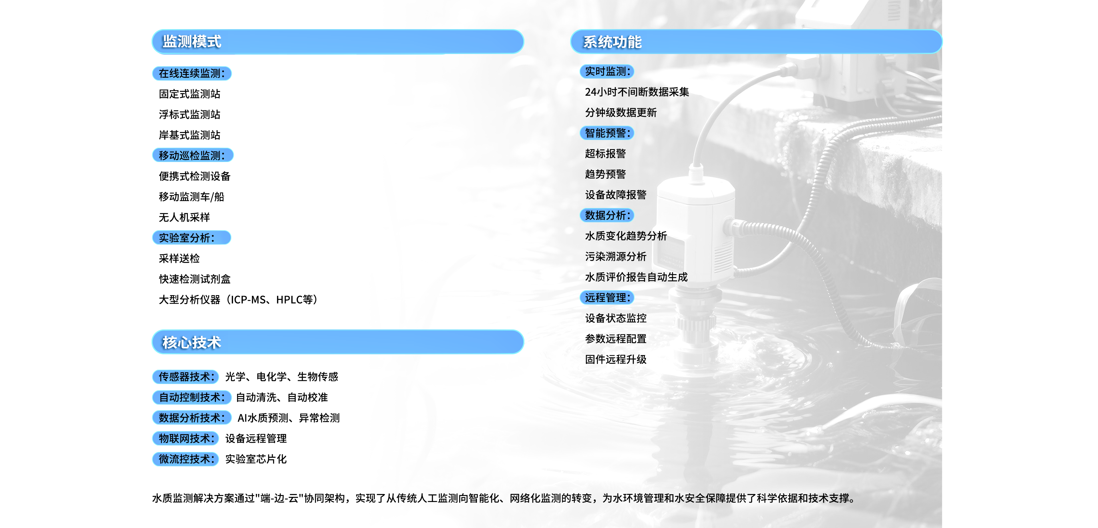 水质监测解决方案通过现代化技术手段,实现水体质量的实时、连续监测与管理。 系统集成了监测设备、数据分析、智能预警等功能,广泛应用于饮用水安全、污水处理、环境保护等领域。 通过精准的数据采集与分析,提升水质管理效率,保障水体安全。