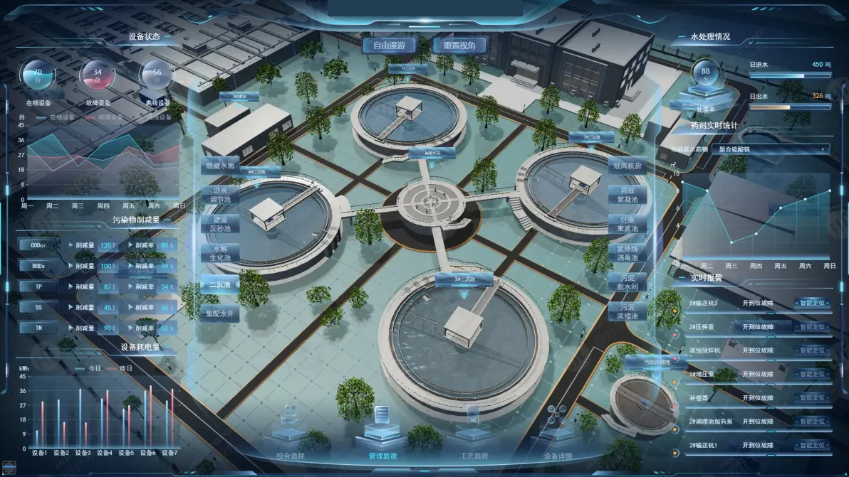数字孪生技术广泛应用于自来水厂、污水处理厂、管网管理等场景。 平台可实时监测水厂设备运行状态,优化工艺流程管理,提升水质稳定性与生产效率。